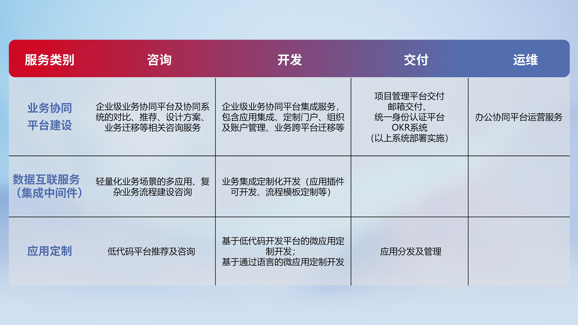 针对钉钉、、、、企微、、IDaas等平台级产品提供产品的规划、、、、方案、、、交付、、定制化开发等服务,,,实现如统一协同办公、、、、智能客户服务、、、混合会议管理、、智能数据查询、、等业务场景,,,实现数字化转型。。