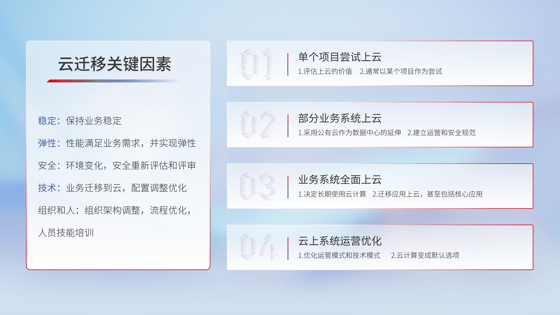结合实际业务,,,,从规划设计、、云平台选型、、云原生改造、、、、数据迁移、、集成交付,,,迁移全过程为客户识别最佳上云路径,,做好风险识别管理,,设计网络架构、、身份权限、、、安全审计合规、、、操作审计、、日志审计、、、、监控告警策略、、、多站点容灾设计等,,,,对云上基础设施进行整体规划,,,,提升IT治理水平,,,以满足弹性、、、高可用、、、、高性能的需求。。。